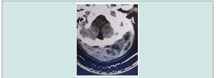 Figure 1: CT scan of skull showing inflammatory otomastoidopathy and presence of hypodense collections.