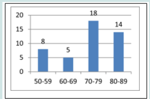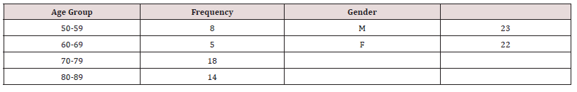 The targeted sample size was 50, however due to advice and restrictions from CHREC to limit the study to the northern region of the district, only 46 participants were recruited. Of the 46 participants, 23 were male and 22 female with a male-to-female ratio 0f 1.1:1. The participants’ ages ranged from 50-89 with an average age of 74 years. Table 1 and Figure 2 shows that there were more participants in the age range 70-79 years but less in 60-69 years. Figure 1 shows that more male participants were recruited than female.