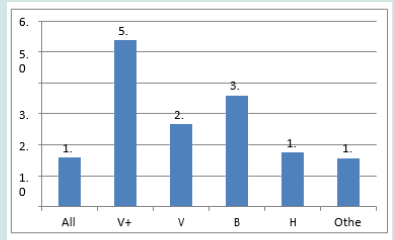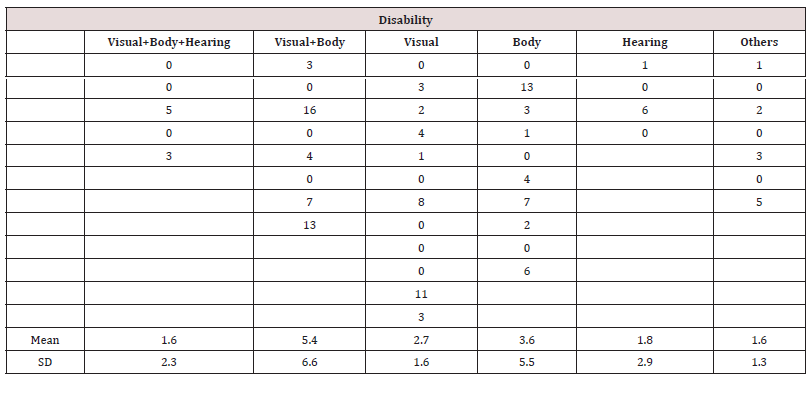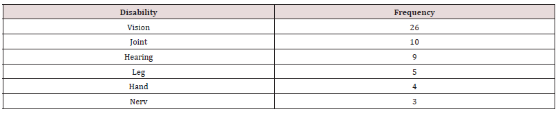 Disabilities were grouped into six (6) groups based on their disability type to ascertain the most frequent type of disability. Figure 3 show that vision has the highest frequency, meaning to say that more participants have visual impairments and impairment related to Nerve was the least frequent types. Now that we have established the most common type of disability in Rendovah district, the types of disabilities were again grouped into four (4) basic groups, namely Visual, Body, Hearing impairments and others. Visual impairments include those with partially blind, blind due to aging and those that blind from birth, Body impairments include hand, joint, leg and nerve impairments, Hearing group are those that are deaf, either at birth or aging, Others group are those elderly that has disabilities other than mentioned above (Table 2). These include, cleft palate, voice function and fluency of speech and limited body activities. While analysing the data, it was found that one person can have more than one type of disabilities, thus the basic groups were regrouped into six (6) subgroups for analysis purposes. Table 3 and Figure 4 indicates that more of the participants have visual and body combined while visual, body and hearing combined and others have the lowest frequency.