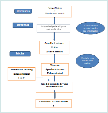 The strategy of the selected articles epitomizes the approach taken during this study. The research on MEDLINE using the Boolean-equation has identified 737 articles. The research on Cochrane and EBSCO has identified the same articles founded with PubMed search so duplicate was eliminated. During the preselecting step, 637 articles were excluded based on titles. After reading, other 41 articles were excluded based on other excluded criteria that we mentioned earlier in the study. Among the 23 selected articles, only 4. corresponded to studies on tooth-supported mini-invasive restoration. One study was included from hand searching [1]. Figure 1 describes the process of identifying the 5 full text articles selected from an initial yield of 737 that were found published from the 2010 up to 2020. Among the 5 selected articles, 2 prospective clinical studies; two randomized split-mouth clinical trials, one clinical trials and one longitudinal clinical evaluation.