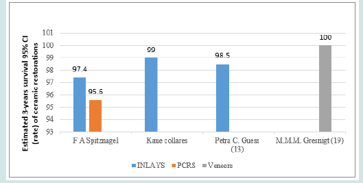 Overall, in the 4 studies reporting ceramic group with a mean follow-up of 3 years+/- 6 months. An estimated failure rate of 0.028 was reported, translated into an estimated 3-year survival of ceramic restoration of 98% (Figure 2). In comparison, all resin restorations had an annual failure rate ranging between 0.025 and 0.104, translating into overall estimated 7 years survival rates ranging between 75% and 88%. This was based on 2 studies. The survival rates of ceramic restorations differed for the various types of ceramics. One study used vitaenamic and rended an estimated 3 year survival rate of 97.4 % for inlays and 95.6% FOR PCRS.