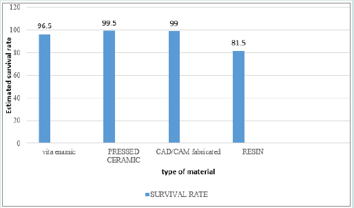 Another study that examined the survival of ceramic inlay/onlay restorations is kaus Collares et AL practice research network .The main finding of this study is that ceramic inlay/onlay restorations have a good survival rate which are comparable to our findings and with other prospective studies on ceramic restoration. However, we could identify three risk factors that can lead to restorations failure which were position of restoration cervical outline , use of a glass ionomer liner and type of adhesive .It has been shown that the risk factors for survival were deep cervical cavity outline related to the more reliable bond to enamel compared to dentin also presence of a glass ionomer lining cement [37]. In this systematic review, pressed ceramic and CAD/CAM all ceramic partial coverage restorations the pooled estimated survival rate was 100% for pressed ceramic and 97% for CAD/CAM for 3 years of follow-up yet this was not a significant difference (p=0.091). One explanation for the similar performance of pressed-ceramics and CAD/CAM porcelain could be the adhesive cementation that likely compensated for the mechanical differences between the 2 ceramic materials [30].