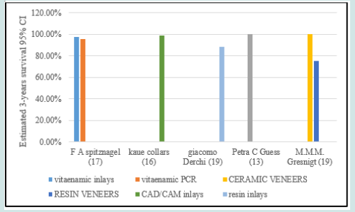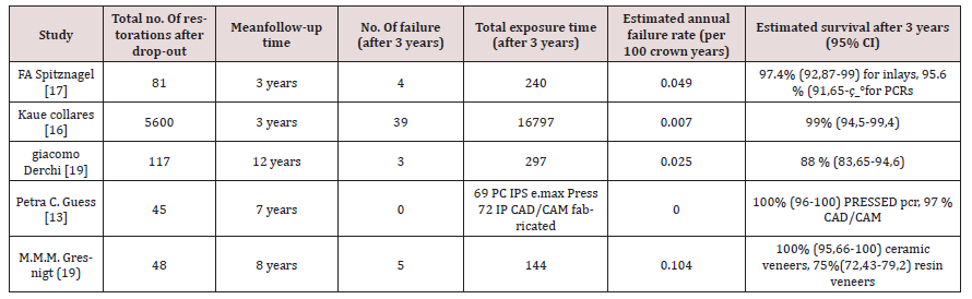 These findings are in correlation with our present review, in fact, the meta-analysis indicated low complication rates. Apparently, strong, and durable adhesion of resin cements to both ceramic and resin increased the survival rate. The tooth-ceramic bond ensures re-establishment of tooth strength. After an observation period of 3 years, the lowest annual failure rates were seen for pressed ceramic PCRs (0 per 100 SCs years). Multivariable random-effect Poisson’s regression showed that resin veneers has significantly higher annual failure rates of about 0.104 per 100 SCs years. Furthermore the analyzing study reporting on ceramic inlays with a mean follow-up time of 3 years had expressed an annual failure rate about 0.028 per 100 SCs years, translating into 3-year survival rate of 98%. According the Derchi et AL twelve years longitudinal clinical evaluation of bonded indirect composite resin inlays, they are reliable options for long term function in posterior region, According to the authors up to 3 years the surface texture, marginal integrity and restoration integrity were acceptable and did not show significant difference.
