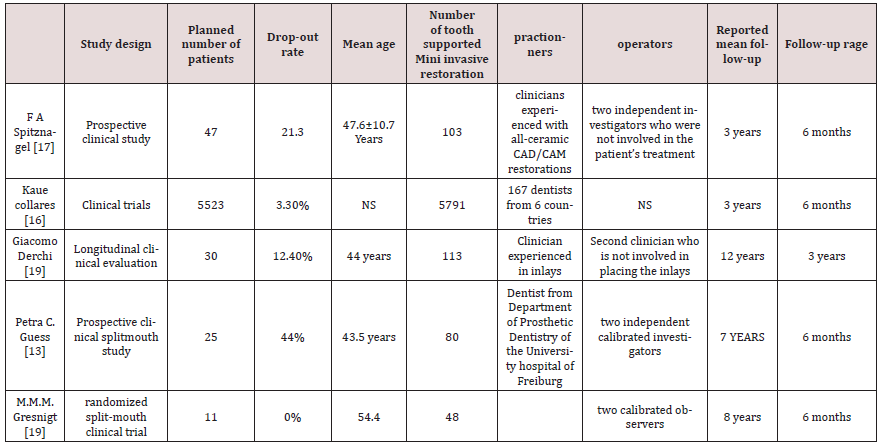 The interest of our systematic review is to compare two types of material (ceramic vs resin) used in mini-invasive restorations in order to find out the one with better survival rate and less complications as well as patient satisfaction. The research was carried out methodically according to CONSORT standards. This search identified a total of 5 articles; the number of articles is considered sufficient and allowing for a systematic review. The risks of bias of the selected studies were analyzed according to the Cochrane collaboration. The methodology was then accepted, and the studies were then included in the systematic review. One of the most important and longest parts of a systematic review is to extract the data from these studies. The data extraction grid developed is at the appendix. This systematic review assessed the survival rate of mini-invasive restorations made by ceramic and resin with minimal follow-up period of three years. The mini-restorative treatments examined in the studies included in this systematic review were performed in both males and females and in a very wide range of ages, covering the whole spectrum of adultery. As it is known, both sex and age are probably the most confounding variables in medical/dental studies, as they are associated with exposures of interest, such as diet, muscular strength and oral hygiene [32]. Studies that included patients with bruxism problem are exculed from this review due to the fact that bruxism is associated with a higher complication rates. In fact a systematic review on bruxism and prosthetic treatment by Johansson et al has shown that bruxism is associated with an increased rate of mechanical and technical complications [33].