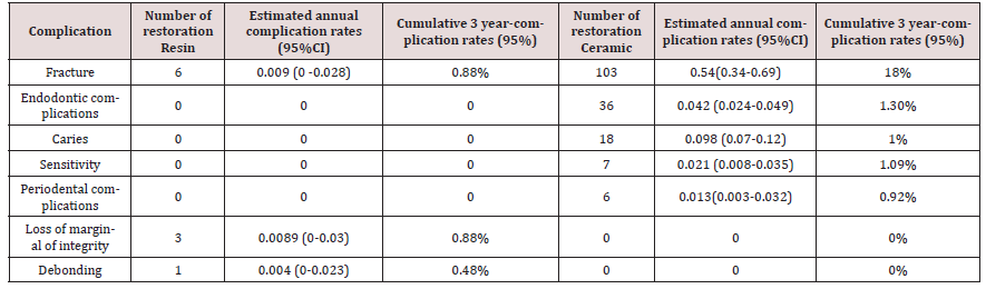 Table 3 displays a summary of biological and technical complications, the solution and the failures for ceramic and resin restorations. Table 1 display an overview of the incidences, the estimated annual complication rates and the cumulative 3-years complication rates of technical and biological complications for ceramic and resin as well as the statistical differences between the restoration types.