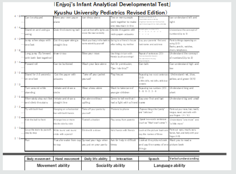 The parents or caregivers were interviewed regarding the presence or absence of visual support in the patients’ daily life, previous dental experiences, the age of the patients during their first experience of physical restraint during dental treatment, amount of time of restraint, and previous history of panic during dental treatment. Periodic dental check-ups, number of periodic dental check-ups, number of dental treatments under intravenous sedation, number of dental treatments under local anesthesia, performing visual support (VS) in a periodic oral examination, and DMF were investigated from dental records. The Enjoji infant analytical development test (Figure 1) was performed to evaluate the developmental age of locomotion, hand movement, basic habits, interpersonal relationships, speech, and language comprehension [9]. Severe behavioral disorders according to the Ministry of Health, Labor, and Welfare (Table 1) were evaluated by interviewing the parents and caregivers.