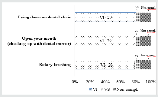 Here, 29 patients (80.6%) were able to execute “lying down on dental chair” and “open their mouth” by verbal instructions, 2 patients (5.6%) were able to execute them by visual support but not by verbal instruction, 28 people (77.8%) were able to accept “brushing their teeth with the rotary brush” by verbal instructions, 2 (5.6%) were able to do it with visual support, and 5 people (13.9%) were unable to do it despite providing both verbal instruction and visual support (Figure 4). Those who could not perform each task from the provided verbal instructions and visual support were the same. Except for five people who could not perform any tasks, 25 people (80.6%) were able to perform all tasks by verbal instruction, and six people (19.4%) required visual support (Figure 5). Regarding the requirement of visual support, two people were provided visual support only for “lie down on the dental chair,” and did not need visual support in the latter two tasks. Two people were provided visual support for “opening your mouth”, and three people were provided visual support for “brushing your teeth with the rotary brush”. Therefore, the participants were classified into two groups: two people in the VS-I group and four people in the VS-II group (Figure 6).