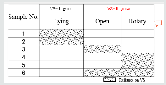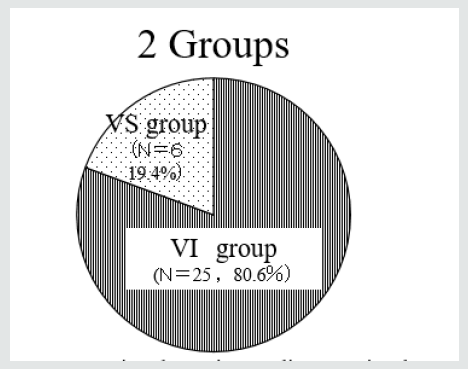 Figure 5: Grouping the patients reliant on visual support (VS). There were 25 persons in the Oral Guidance (VI) group and 6 persons in the VS group except for the 5 persons of non-compliance groups.