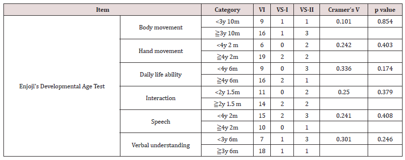 Figure 3: Patient distribution according to Enjoji’s developmental age. The median age for interaction and speech is around 2 years, which is far below that for the other items.