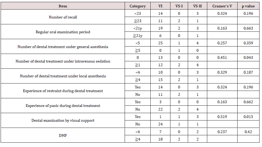 No association was found between developmental age and implementation of visual support in all groups. Items that were found to be related to the implementation of visual support were “the previous history of panics that are difficult to deal with,” “number of experiences with intravenous sedation,” and “performing VS in a periodic oral examination” (Tables 3-6).