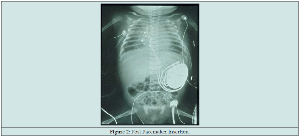 Fetal cardiovascular study still showed atrioventricular dissociation, this time ventricular rate now noted at 50 per minute. Atrial rate was normal at 136 per minute. Chamber sizes remained within normal limits for fetal age with normal Z score indicating absence of heart failure despite deterioration of fetal heart rate. Ventricular wall motion, contractility, and systolic function remained good. Still no signs of hydrops fetalis noted at this point. But on the 36 weeks’ gestation, drop in the fetal heart rate was noted, now to 50bpm hence the mother was immediately admitted for the proposed EXIT procedure and AS’ pacemaker insertion. Primary cesarean section under general anesthesia was done at 36 weeks AOG. Upon delivery, EXIT procedure, epicardial pacemaker insertion via median sternotomy, and left femoral artery cannulation were performed and the patient was then transferred to the Neonatal ICU (Figures 1 & 2). Patient’s APGAR score is 2, 7 with a maturity rating of 36 weeks AOG. Pertinent physical examination revealed a bradycardic and pale newborn, no gross deformities, no murmur, no hepatomegaly, no cyanosis with cold and fair pulses [4].