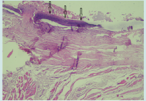 Figure 1: Microscopic examination revealed calcified cyst wall (arrow) with lymphocytes and plasma cells (hematoxylin-eosin, x 100).