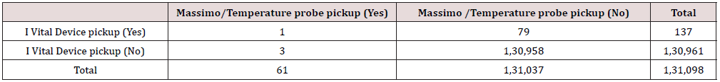 Similarly, subgroup analysis was done for different parameters namely Heart rate, Saturation and Temperature. No major differences were noted in the results. The statistical analysis of performance I Vital system when compared to conventional monitoring system indicates that it can be used as an alternative to routine monitoring in places where it is technically feasible. The positive predictive value of the system is hampered by the false alarms due to movement and light interaction and it is suggested that few improvements could be made to the existing system like use of opaque cloth to cover the probe site, use of better sensors which use signal extraction technology which have been found to be associated with lesser incidence of movement and light artifacts.