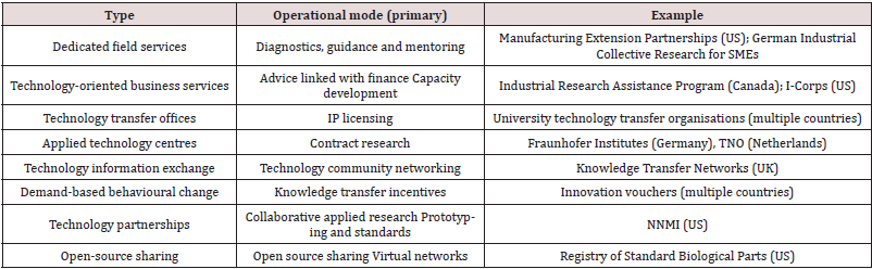 A critical issue is how already-developed technologies diffuse. The issue is twofold. First, it is about increasing new-firm entry and the growth of firms which are major carriers of new technology. Secondly, it is about increasing productivity in established firms which face obstacles to implementing technology [18]. The two aspects of technology diffusion-firm entry and growth, and more general absorption-involve different policy instruments. Several factors shape the diffusion process at national and international levels: (i) global connections via trade, FDI, participation in GVCs and the international mobility of skilled labour; (ii) connections and knowledge exchange within the national economy, such as the interaction between scientific and higher education institutions and businesses; (iii) the scope that exists for experimentation by firms-especially entrants-with new technologies and business models; (iv) the extent of complementary investments in R&D, skills, organizational know-how (i.e. managerial capabilities) and other forms of knowledge-based capital [30]. The causes of inefficient resource reallocation can be many, including a lack of product competition, rigid labour markets, disincentives for firm exit, barriers to growth for successful firms, and policy conditions such as restrictions on trade. For example, the sensitivity of capital investment to a change in the patent stock is almost double in countries where contract enforcement is less costly (such as Norway), relative to countries where it is more costly (such as Italy) [31,32]. examined how long it takes technologies to be adopted in developed and developing economies, and how intensely those technologies are used. For 25 technologies, the authors find a convergence in adoption rates across countries, but divergence in the intensity of use. Learning how to use new technologies is still a challenge for companies in many developing economies. Conditions which facilitate such learning include open trade, efficient skills allocation, managerial quality, the volume of business R&D, and the capacity of governments to develop and implement e-government services [30]. Institutions for technology diffusion are intermediaries, structures and routines that facilitate the adoption and use of knowledge, methods and technical means. Some of the institutions involved, such as technical extension services, tend to receive low priority in the standard set of innovation support measures. But there is evidence that they can be effective, if well designed. The conventional rationale for supporting institutions and mechanisms for technology diffusion builds on information deficiency and asymmetry and other market failures. Enterprises (especially SMEs) frequently lack information, expertise and skills, training, resources, strategy, and confidence to adopt new technologies; suppliers and private consultants can experience high transaction costs in trying to diffuse technologies; and finance for scale-up and implementation is not always forthcoming. Support from technology diffusion institutions seeks to guide and support enterprise capabilities, adoption, and justify investment choices in new technology. In the fast-moving environment of next generation production technologies, the conventional market failure rationales for institutional intervention are likely to become even more important, to aid potential users to sift through burgeoning amounts of information and to support decision making in the context of rapidly changing technologies and expertise requirements. Innovation systems invariably contain multiple sources of technology diffusion, such as universities and professional societies. Table 1 offers an initial typology. The need for new strategies to promote institutional change, knowledge exchange, capacity development, and demand-led initiatives for technology diffusion has given rise to new initiatives, some of which are experimental. New production technologies have stimulated partnerships that cross-sectoral boundaries and address problems of scaling up from research to production. Alongside established applied technology centers, such as the Fraunhofer Institutes in Germany, there is an increase in partnership-based approaches. An example is the US National Network for Manufacturing Innovation (NNMI). The NNMI uses private non-profit organizations as the hub of a network of company and university organizations to develop standards and prototypes in areas such as 3D printing and digital manufacturing and design. Analogous to the rise of open sharing of research articles and data is the emergence of libraries promoting sharing of technological building blocks. For example, Bio Bricks is an open-source standard developed at MIT to enable shared use of synthetic biology parts through the Registry of Standard Biological Parts. Such open-source mechanisms in biotechnology exist against a backdrop of traditional proprietary biotechnology approaches. For example, the Innovation Corps (I-Corps) programmer was established by the US National Science Foundation (NSF) in 2011 to accelerate commercialization of science-intensive research. Teams of researchers and budding entrepreneurs receive grants to attend training, which encourages ongoing interaction with customers and partners. The program enhances the knowledge of participants and their capacity to start companies around NSFfunded research [33]. Attention to the procurement of innovation by government agencies has grown across many countries, often targeted to SMEs. Incentives such as R&D tax credits, regulations and standards are also being used to encourage pre-commercial R&D activities, such as feasibility studies and prototyping. The effectiveness of technology diffusion institutions depends in part on firms’ absorptive capabilities. This suggests the importance of efforts to foster demand through such mechanisms as innovation vouchers, which encourage users to engage
