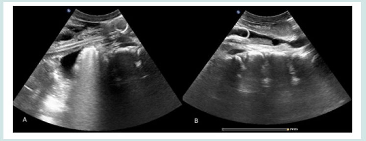Figure 2: Ultrasound image (A) foley’s catheter with balloon in left proximal ureter (B) debris within ureter proximal to foley’s catheter balloon.