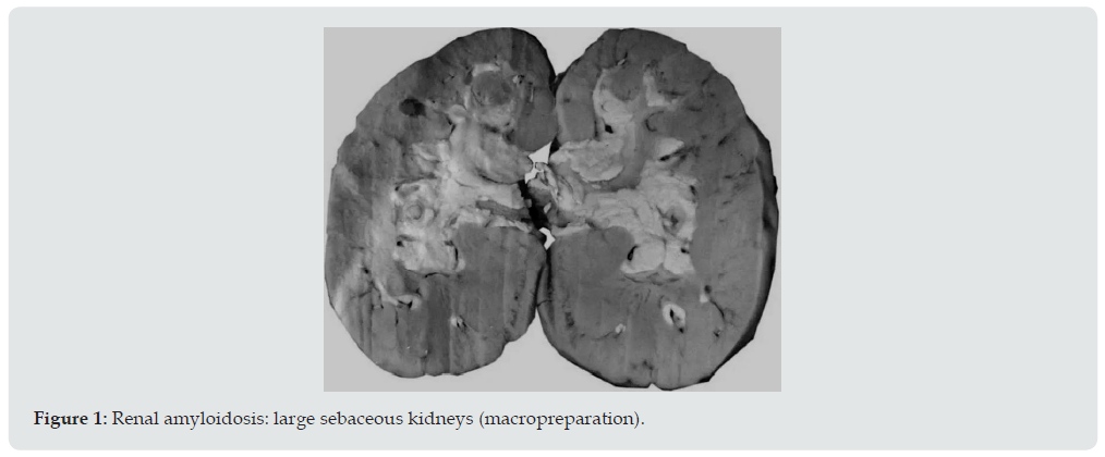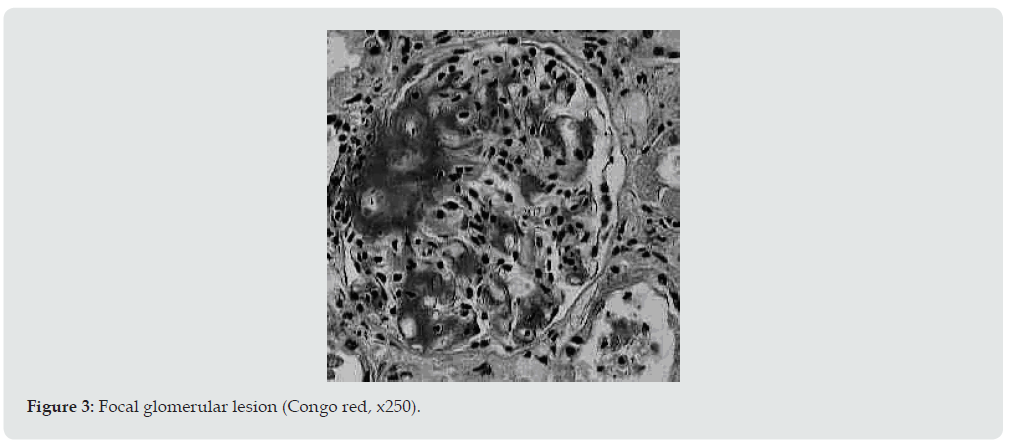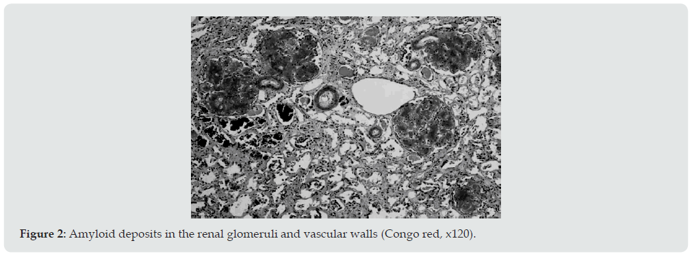 Persistent proteinuria was observed in all patients, but its level was different. In 1 patient, the protein content in the urine was only 0.0033%, in 3 it did not exceed 0.33%, in 2 — 1.65%. Most often, the maximum level of proteinuria was kept within 3.3% (5 patients), sometimes reaching 6.6% (3 patients). The daily loss of protein was determined only in 5 people. It was 2.4-3.3 g. Such disorders are quite typical for renal amyloidosis [15]. A constant phenomenon was a small persistent leukocyturia. The number of leukocytes in the friction field ranged from 1-2 to 15-30 (in one-time single analyses in a 67-year-old patient). Hematuria was observed in 9 patients, was unstable and very moderate. The number of red blood cells was usually from single to 2-4 in the friction field. Only occasionally in some patients, hematuria reached 10-15 cells in the friction field. In 9 patients, transient small cylindruria was noted. The cylinders are usually hyaline and granular, occasionally waxy. The number of them in the friction field is up to 2-3, sometimes 5-6. The described features of urinary sediment are considered typical for urinary syndrome in renal amyloidosis [16].