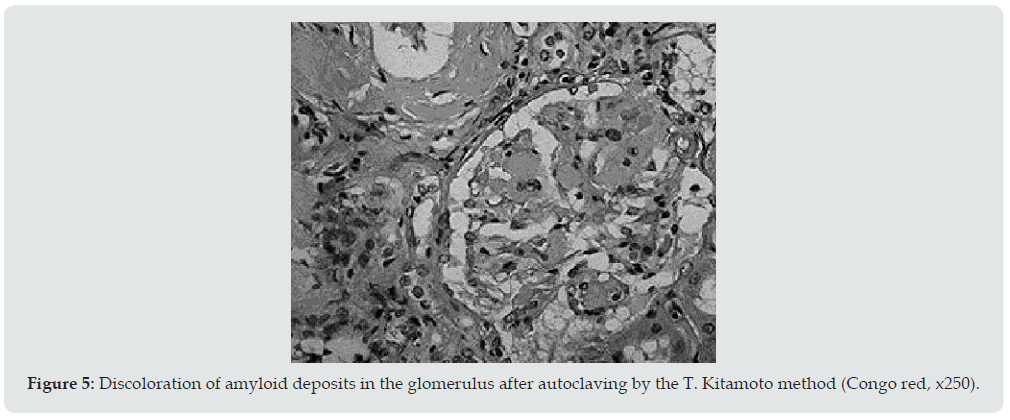 Ultrasound examination of the kidneys was performed in 6 patients, and in 4 of them repeatedly. Diffuse changes in the renal parenchyma were noted in all conclusions. Blood pressure in 13 patients was constantly within the normal range or even slightly lowered, which is characteristic of kidney amyloidosis. Only 1 of the examined 2 months before death had arterial hypertension with figures 160/110-190/100 mmHg. It is interesting that the same patient, the only one of all, did not have pronounced hypo— and dysproteinemia. In addition, shortly before his death, his urea and creatinine levels increased moderately. Summing up the description of clinical data, it can be stated that 4 patients died in the proteinuric stage of renal amyloidosis, 9 — in nephrotic, 1 patient had the transition of the latter to the azotemic stage. The death of patients occurred from various causes. Six died during the period of advanced nephrotic syndrome from increasing heart failure. A similar mechanism of death in renal amyloidosis is well known [18]. Three died from acute pneumonia and coronary pathology, one from hemorrhagic stroke and drug toxicoderma. The section revealed a typical picture of kidney amidoidosis [19]. In 11 of the deceased, these were the so-called large sebaceous kidneys (Figure 1), their mass ranged from 480 to 960 g. In 3 cases, the kidneys were amyloid wrinkled (weight 300-340 g). In 4 cases, in addition to the kidneys, the spleen was affected by amyloidosis, and in 1 of them the liver was also affected. Microscopically, congophilic amyloid masses were found in the capillary loops of the glomeruli and in the vessel wall (Figure 2). The intensity of amyloid deposition in glomeruli ranged from focal (Figure 3) to total lesion (Figure 4). At the same time, the severity and prevalence of the process correlated with the clinical stages, as well as with the duration of antipsychotic therapy. So, with a treatment period of more than 15 years, a total lesion of the vast majority of glomeruli was detected in all cases, and with a shorter period — only in 1 out of 6. In polarized light, the characteristic dichroism of amyloid was revealed in the form of a light greenish glow. During denaturation of amyloid by means of temperature action (autoclaving of sections before painting the congo red at a temperature of 130 ° C) by the method of T Kitamoto (1986) [20], its tinctorial properties were lost within 30 minutes (Figure 5), which is inherent in the AA-type of amyloid.