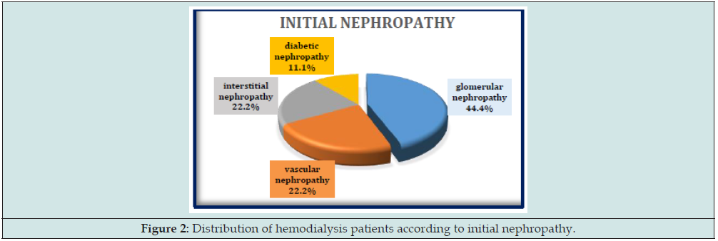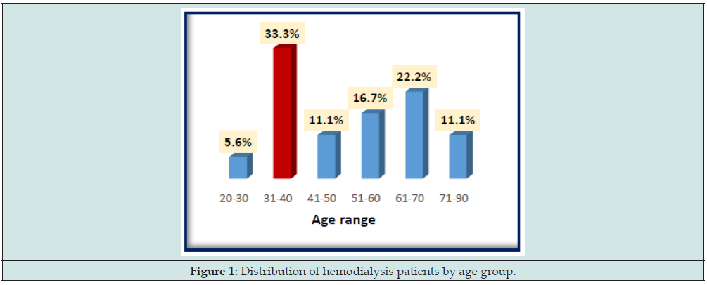 Our study was conducted in 2021 in 18 chronic hemodialysis patients at CMH. There are 9 men and 9 women, with a sex ratio of 1. The average age is 50.94±17.46 years. The median is 49.5 years with age extremes ranging from 26 to 88 years. Half of our patients are under 50 years old. The 31-40 age group is the most represented in 33.3% (Figure 1). Glomerular nephropathy is the leading cause of end-stage CRF in our patients in 44.4% (Figure 2). The average duration of hemodialysis is 8.72 ± 3.878 years. According to the KDIGO 2009, the biological targets for calcium phosphate balance proposed for patients with CRF and on dialysis are total serum calcium between 2.1 and 2.55 mmol/l, serum phosphate towards the norm (0.8–1.45 mmol/l) and a serum PTH concentration two to nine times the upper limit (130–500 Pg/ml). Our patients have a correct calcemia in 50% and hypocalcemia in 44.4%. Hyperphosphatemia is found in 61.1% and PTH greater than 500 Pg/ml is found in 50% of cases (Figure 3). The inflammatory assessment finds: an accelerated ESR in 66.7% and a high C-reactive protein in 27.8%, anemia is found in 44.4% and uric acid is greater than 74 mg/l in 55.6% cases.