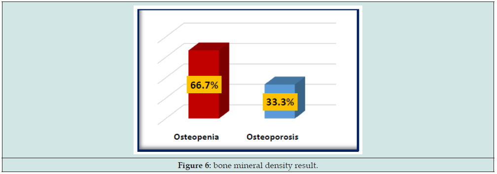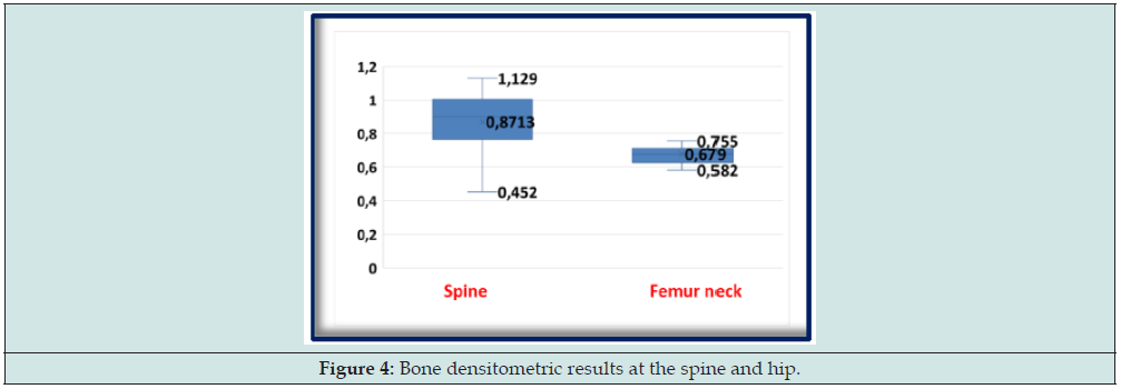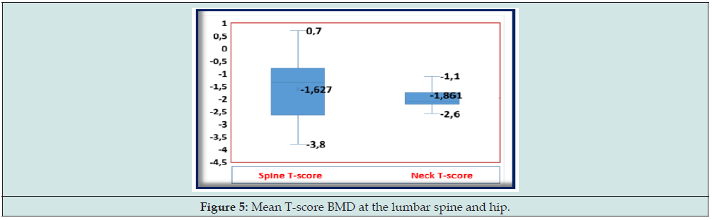 The measurement of BMD by dual X-ray absorptiometry finds an average BMD at the level of the spine is 0.871 ± 0.173 g/cm2 with a maximum of 1.129 g/cm2 and a minimum of 0.452 g/cm2, and 0.679±0.099 g/cm2 at the left hip with a maximum of 0.755 g/ cm2 and a minimum of 0.582 g/cm2 (Figure 4). The mean standard deviation T-scores, all sexes combined, is -1.628 ± 1.197 SD at the level of the spine and negative -1.861 ± 0.622 SD at the level of the left hip. (Figure 5). Patients with a T-score < -2.5DS at the hip or spine were classified as having had osteoporosis. The prevalence of osteoporosis is 33.3% (T-score <2.5) including 83.3% trabecular osteoporosis, while osteopenia is found in 66.7% including 83.3% osteopenia cortical (Figure 6). The multivariate analysis made it possible to note in a statistically significant way 03 risk factors of osteoporosis and which are the duration of hemodialysis superior to 10 years (p=0,026), the hypocalcemia (p=0,04) and the hyperparathyroidism greater than 500 Pg/ml (p=0.009). These risk factors are represented in the Table 1.