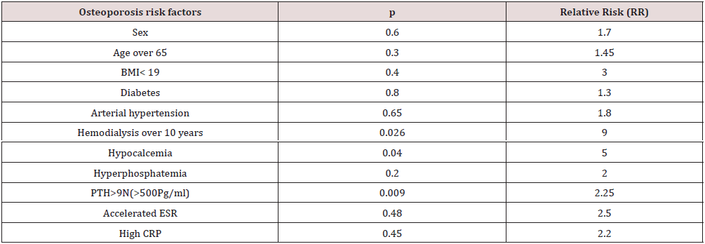 Multivariate analysis could identify 03 risk factors for osteoporosis in a statistically significant manner, namely, duration of hemodialysis greater than 10 years, hypocalcemia, and hyperparathyroidism greater than 500 Pg/ml.